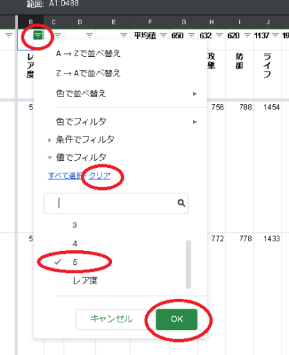 文字ソートは1ワードのみのようですので、特殊スキル・属性リンク・受動スキルの項目は同じものを3か所用意しました。うまくつかってくださいね!
